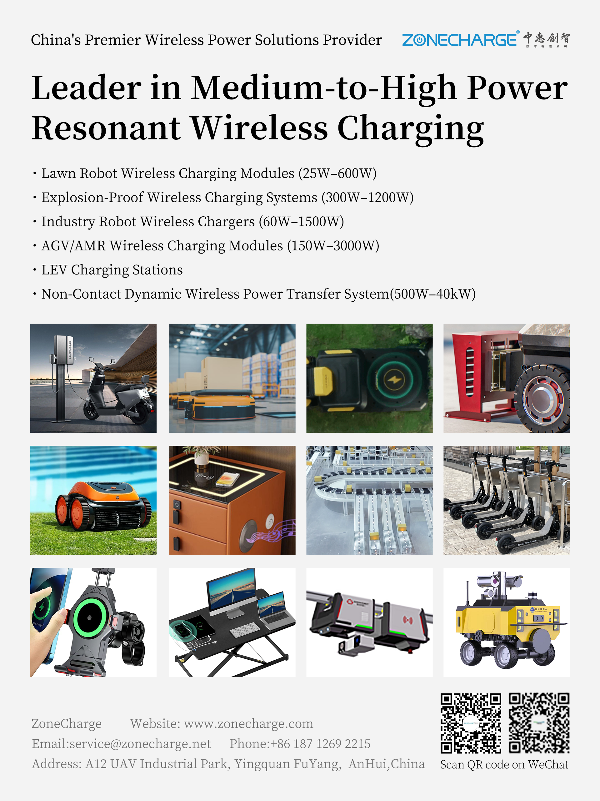 公司研发团队由国务院津贴专家、博士领衔,基于耦合式磁共振的无线电能传输核心技术,产品覆盖2-22KW功率范围,方案和产品的应用已经覆盖移动机器人充电、电动交通工具、自动化设备、3C家电、水下机器人、医疗器械等等400多个应用领域。