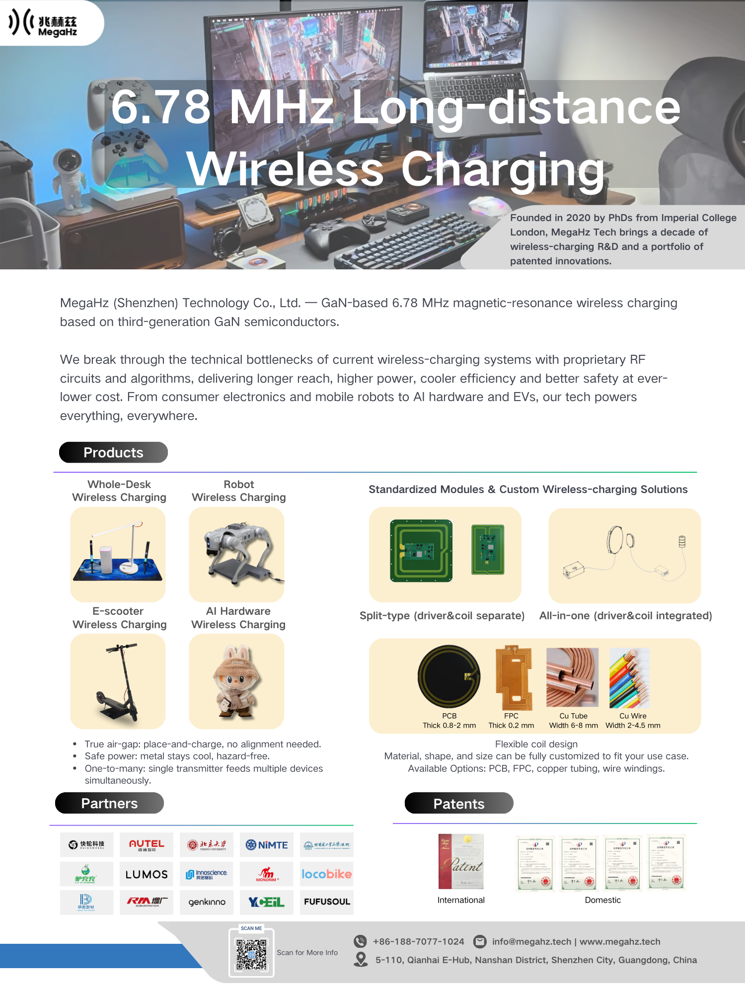 兆赫兹是一家专注于下一代无线充电的公司,团队成员来自英国帝国理工、香港科技大学、香港大学及哈工大等知名高校。公司主要研发高频无线充电技术。公司突破了高频电力传输过程中复杂电路设计及控制算法问题,可提高无线充电的功率、距离及充电范围,实现高转化效率且安全无线电力传输,配合其成本不断下探及不发热的优势,能够为客户提供全新的便利性使用体验,兆赫兹的技术将广泛应用于目前各种电子产品的使用场景,在移动机器人、消费电子及新能源汽车领域均展现出巨大的市场潜力。