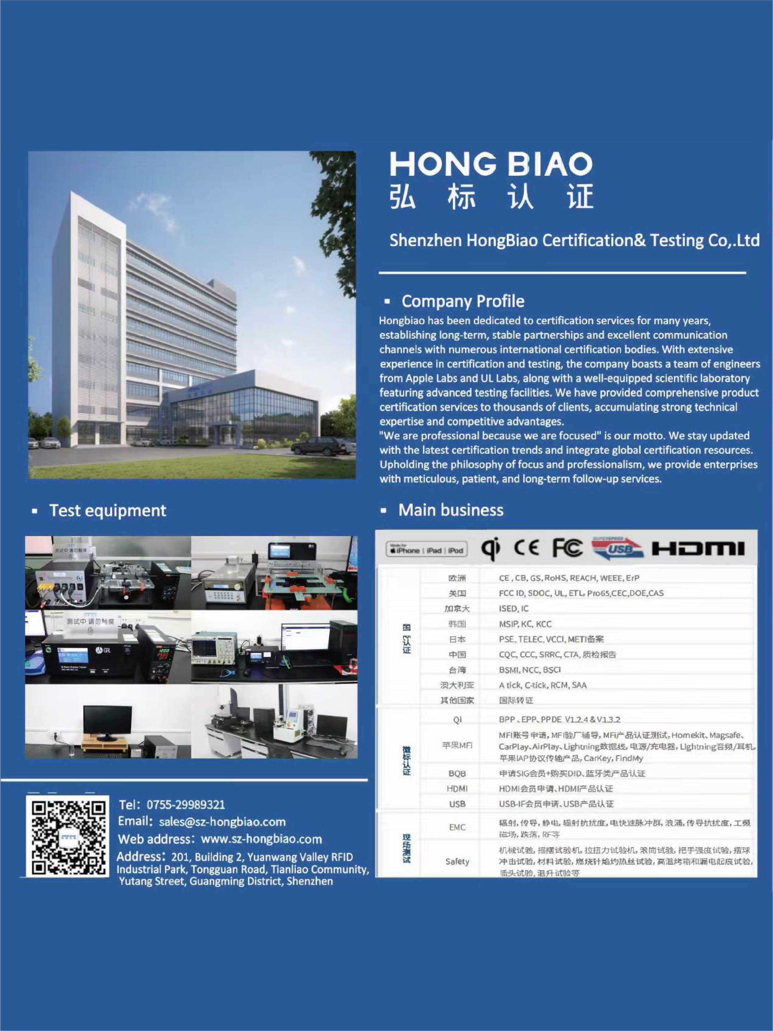 弘标认证检测有限公司是一家综合性的第三方认证检测机构,业务涵盖检验、检测、认证、技术服务,为企业提供一站式的认证测试解决方案。目前拥有电磁兼容、无线射频、产品安全、车载多媒体互联、无线充电、苹果MFi、数字多媒体接口等多个实验室。
