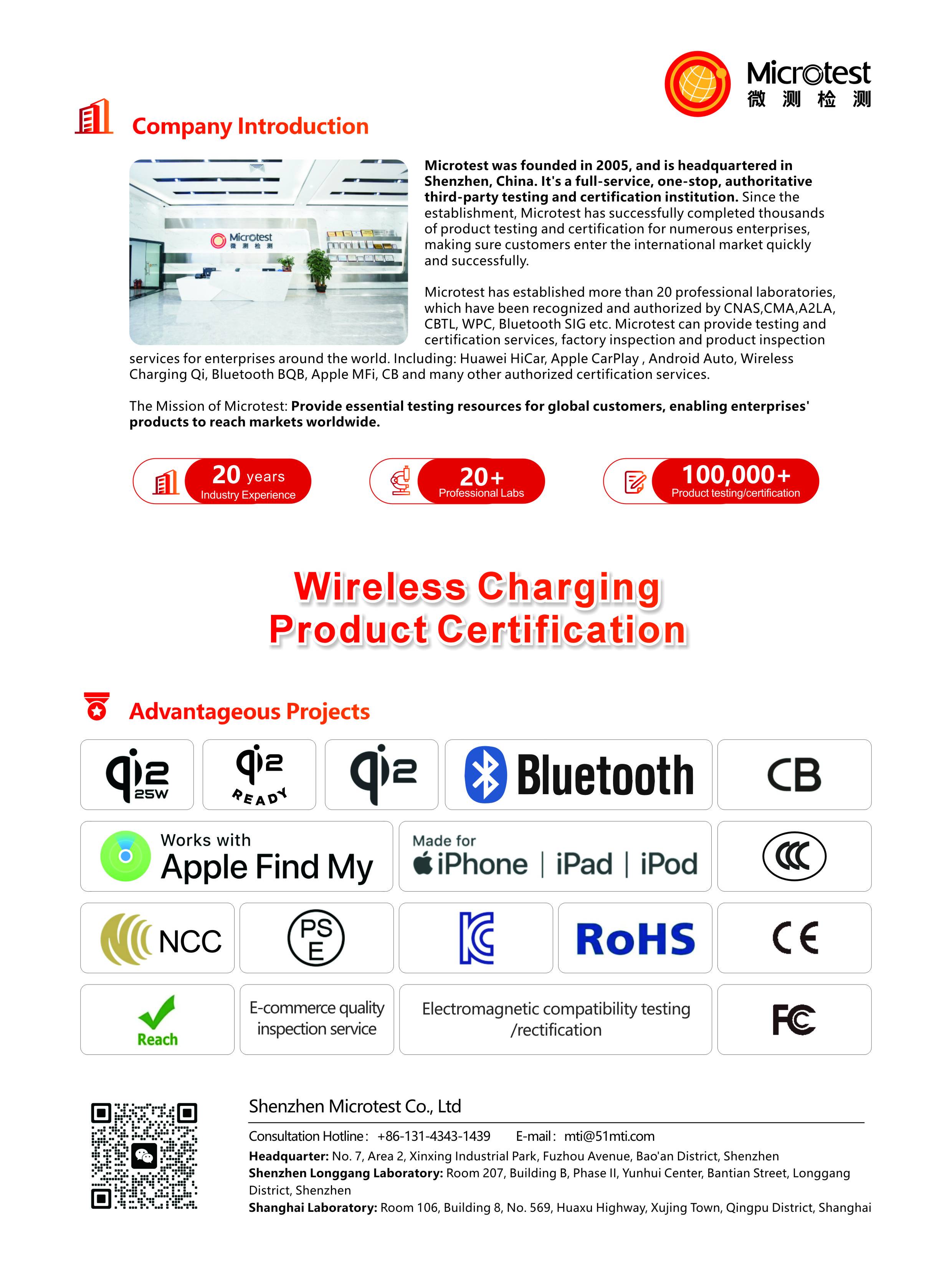 Microtest微测检测已建立起20余个专业实验室,128人的工程师团队,10000㎡检测科技园,已获得CNAS、CMA、A2LA、CBTL、WPC、Bluetooth SlG、等授权和认可,可为企业提供全球上百个国家的测试与认证、验厂与验货服务。包括:华为HiCar、无线充Qi、蓝牙BQB、苹果MFi等众多授权认证服务。