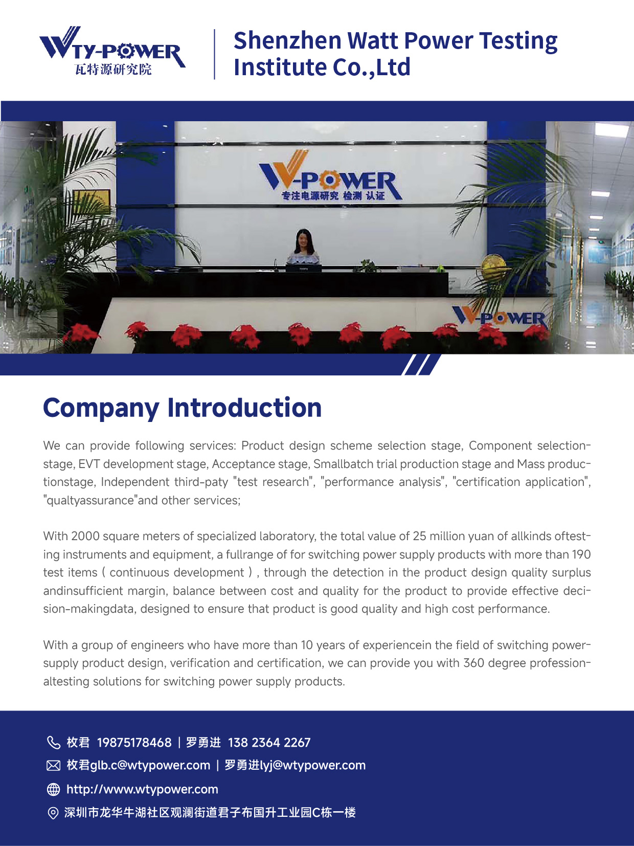 2015年成立,瓦特电源,即代表功率W,寓意专注电源DVT服务;深圳市瓦特源检测研究有限公司,专注开关电源细分领域国内首家第三方检测实验室,属于技术密集型企业。公司专业提供开关电源产品设计方案选型阶段、器件选型阶段、EVT开发阶段、DVT开发阶段、验收定型阶段、小批试产阶段、量产阶段的第三方试验、检测与评价服务。